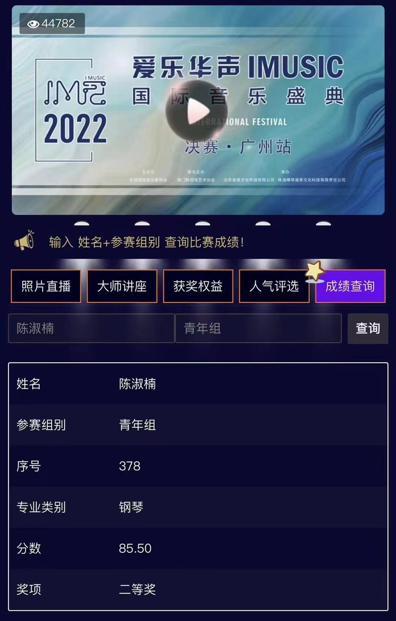 7月17日,2022爱乐华声· 国际音乐盛典决赛在广州拉开帷幕。本次大赛的评委均是来自国内各大高校的专家教授、国家一级演员等,参赛选手们也特别珍惜展示自己的机会,每首作品都唱出了他们对声乐的无限热爱。最终,经过为期5天激烈的角逐后,新葡的京集团教育学院音乐学专业2019级陈淑楠同学荣获二等奖。 供稿、图片 | 教育学院