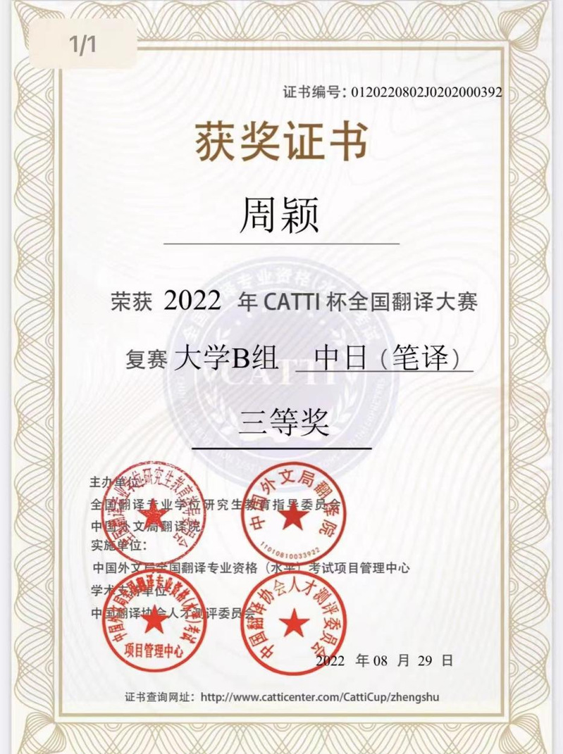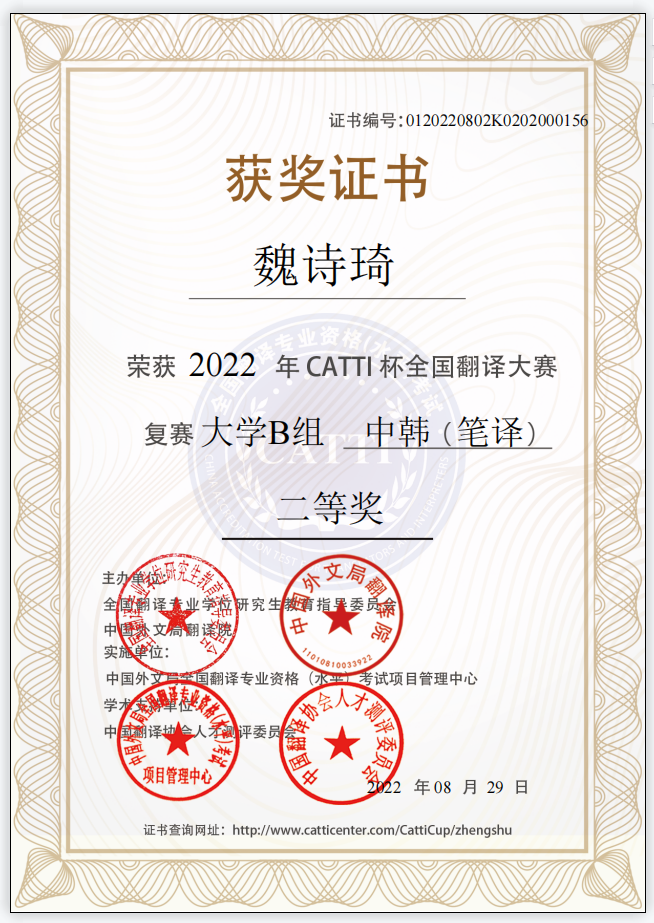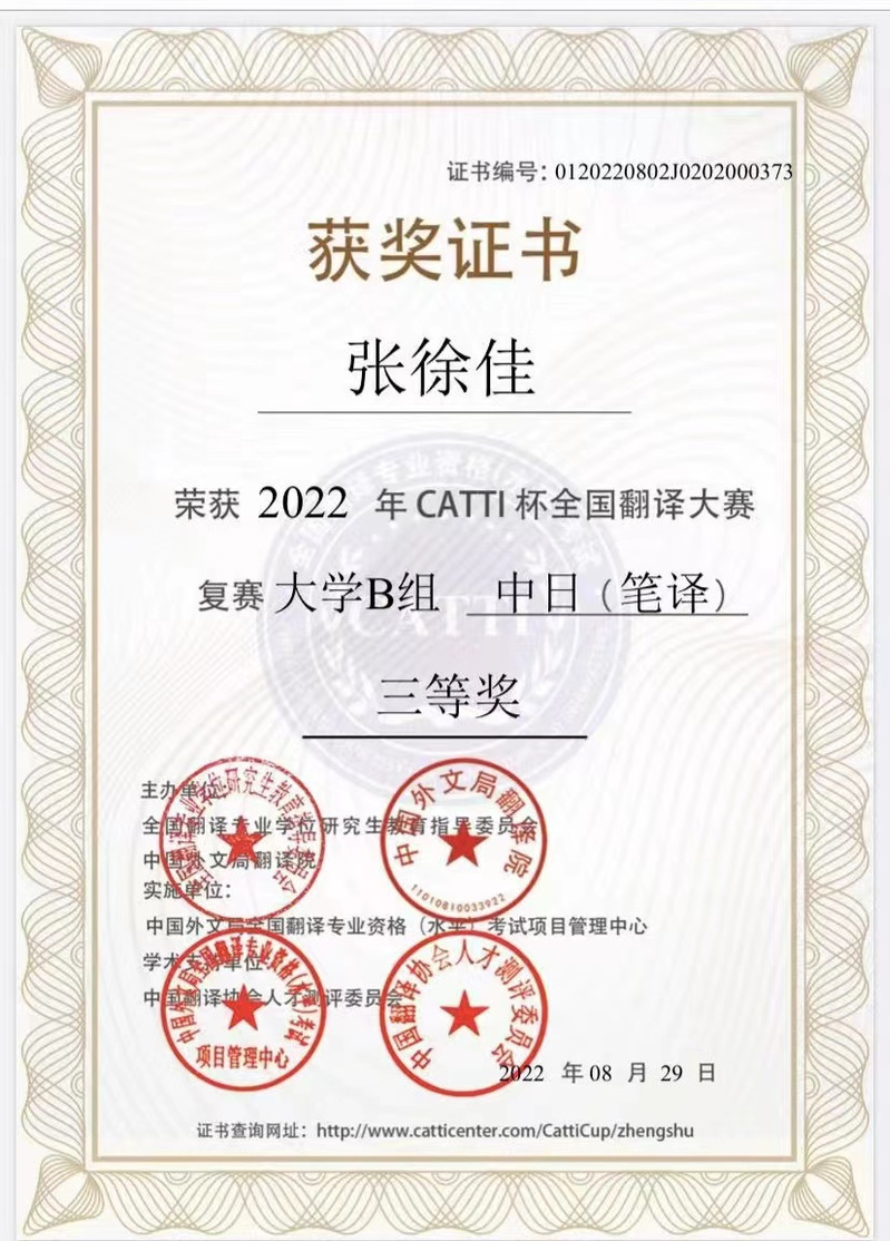 金秋送爽,硕果飘香!朝鲜语专业2018级1班魏诗琦同学在朴英花老师的指导下荣获2022年CATTI杯全国翻译大赛复赛大学B组笔译二等奖。日语专业2019级张徐佳和周颖两位同学, 在张彩虹老师的指导下获得了2022年CATTI杯全国翻译大赛复赛大学B组笔译三等奖的好成绩。