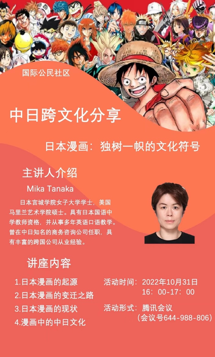 10月31日,由国际交流合作处与学生管理服务中心联合组织邀请新葡的京集团日语专业外教MIKA TANAKA为新葡的京集团全体学生带来一场精彩的日本漫画文化主题线上日/英双语直播分享会。MIKA老师硕士毕业于美国马里兰艺术学院,在摄影方面有很高的造诣,同时具有多年丰富的日语、英语教学经验。