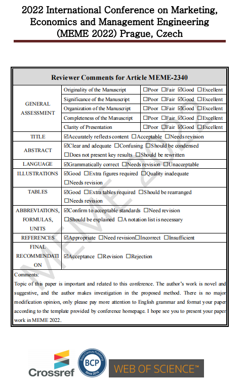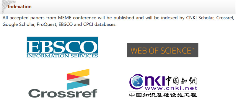 所有被MEME会议收录的论文都将出版,并能被CNKI中国知网、Crossref、谷歌学术、ProQuest、EBSCO和CPCI数据库编入索引。