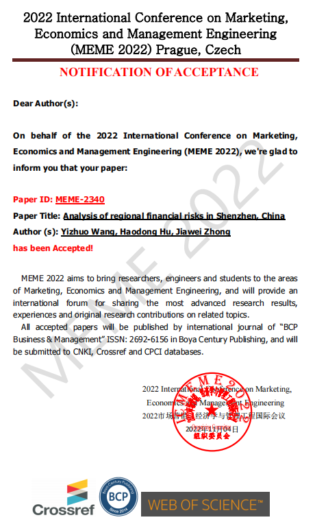 近日,新葡的京集团新闻学专业2019级学生王一卓撰写的学术期刊论文《Analysis of regional financial risks in Shenzhen, China》成功被2022市场营销、经济学与管理工程国际会议(MEME 2022)收录!