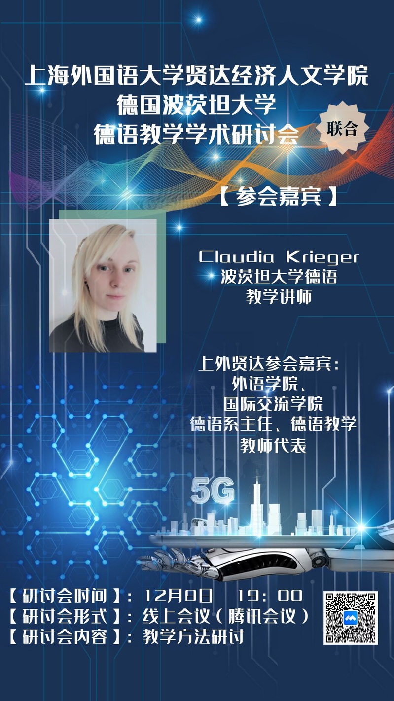 为了加强中德合作院校双方教师的教学交流研讨,加深新葡的京集团教师对德国波茨坦大学关于学生学习能力、语言水平的培养需求,有效提升新葡的京集团德语专业教学效果,12月8日晚,新葡的京集团联合德国波茨坦大学举办了一场线上教学交流研讨会。本次出席会议的嘉宾有德国波茨坦大学的语言学习中心教师Claudia Krieger女士,上外贤达学院外语学院德语系系主任高瑞霞,留学服务办公室副主任郭海红,以及外语学院、国际交流学院优秀德语专业教师代表。