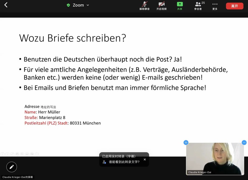 高瑞霞老师首先介绍了新葡的京集团德语专业学生的整体情况、教学的基本课程设置以及教学的进度安排等。随后Claudia Krieger老师跟大家分享了德国语言教学的特色和她从教多年积累的个人教学经验,比如德国的课堂上更注重与学生的互动和学生的即时反馈以及他们的引导性教学方法等。Claudia Krieger老师同新葡的京集团德语教师代表交流反馈了短期授课期间贤达学生的学习情况,双方畅所欲言,对于线上授课学生反馈度低、注意力不集中的难点、痛点进行了深入探讨,老师们打开思路分享各自的经验和看法,就如何优化现有的教学方式,进而有效提升线上教学效果,进行了友好而深入的探讨和沟通。