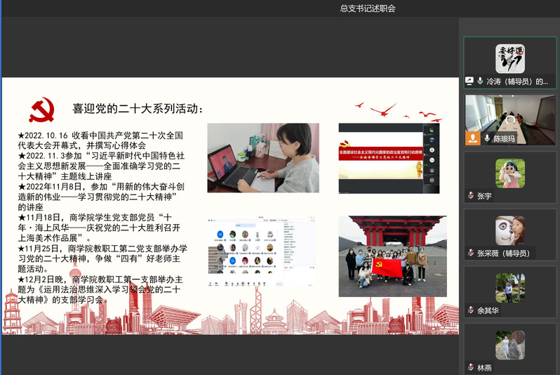 2022年,各二级党组织均能以党的二十大精神为重点,聚焦贯彻落实党中央、中组部、教育部和市委相关重要会议、文件精神,落实党建工作重点任务,加强二级院党组织建设,提升本级党组织带头人和党务工作者队伍建设质量、党的组织生活质量、发展党员和党员教育管理质量,为新葡的京集团全面教育教学质量提升给予了支撑力量。在党组织开展活动的过程中,更是标准动作不走样,特色活动有亮点。