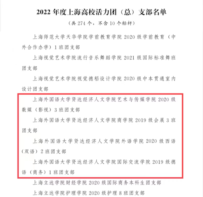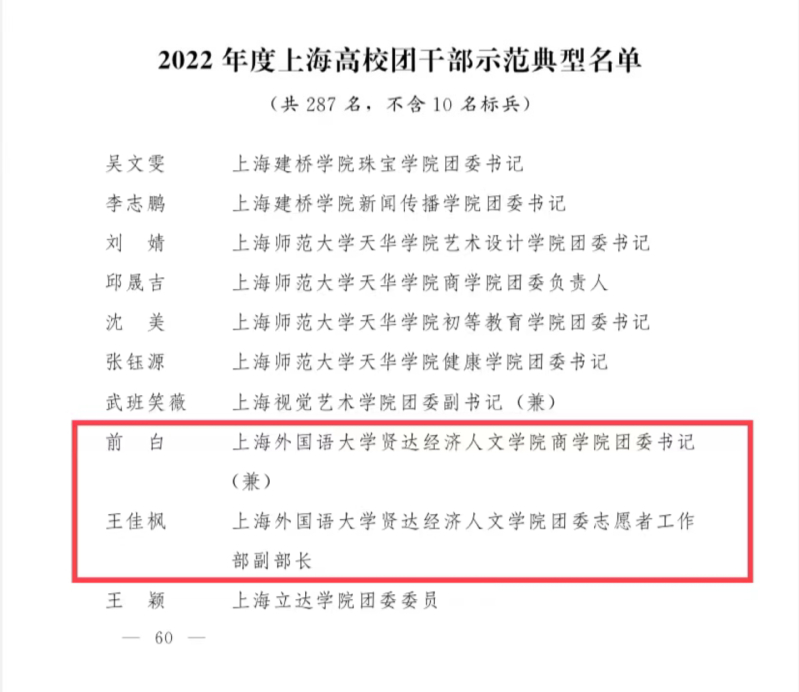经学校团委选拔推荐,上海市教委、团上海市委审核决定,授予新葡的京集团2020级数媒(影视)3班团支部、2019级会展3班团支部、2020级西语(双语)2班团支部、2019级德语(商务)1班团支部等单位“2022年度上海高校活力团(总)支部”称号,授予思涵辩论社等单位“2022年度上海高校活力社团”称号,授予商学院团委书记前白、校团委志愿者工作部副部长王佳枫等个人“2022年度上海高校团干部示范典型”称号。