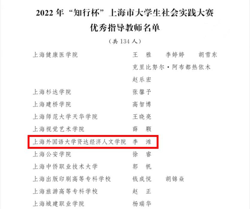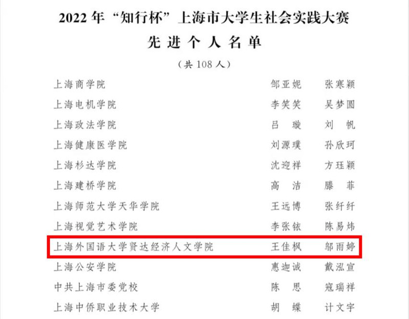 新葡的京集团商学院2020级工商管理3班王佳枫同学、艺术与传媒学院2021级新闻(双语)1班邬雨婷同学荣获2022年“知行杯”上海市大学生社会实践大赛“先进个人”称号。校团委李滩老师荣获2022年“知行杯”上海市大学生社会实践大赛“优秀指导教师”称号。