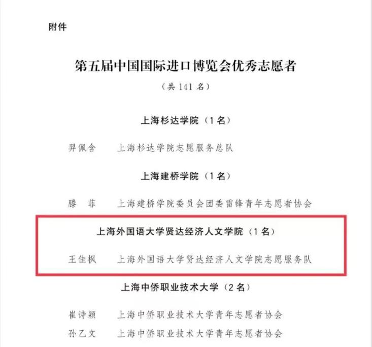 为更好地激励广大志愿者积极投身志愿服务事业,培育志愿文化,推动志愿服务精准化、常态化、便利化、品牌化发展,经学校团委推荐,市文明办、团市委核准,商学院2020级工商管理3班王佳枫同学荣获“第五届中国国际进口博览会优秀志愿者”称号。