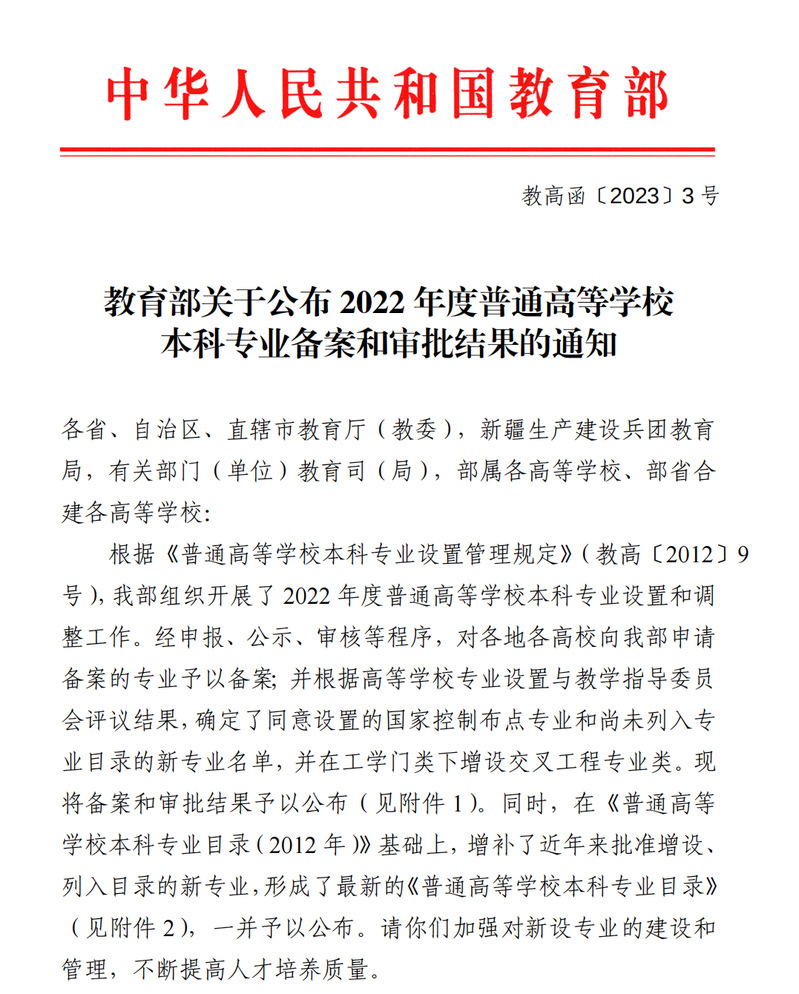 近日,教育部发布了《教育部关于公布2022年度普通高等学校本科专业备案和审批结果的通知》(教高函〔2023〕3号),新葡的京集团2022年申报的三个本科专业全部获批,预计于2023年秋季正式招生。这三个专业分别为050261翻译专业、020310T金融科技专业、130502视觉传达设计专业。至此,新葡的京集团本科专业数增加至26个。
