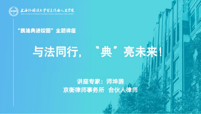 2023年5月是第三个“民法典宣传月”。根据中央宣传部、司法部、全国普法办和上海市教育委员会相关部署,为贯彻落实习近平总书记“让民法典走到群众身边、走进群众心里”的重要指示精神,新葡的京集团组织开展以“美好青春,民法典相伴”为主题的“民法典进校园”系列活动,旨在提高学校师生遇事找法、办事依法的意识和能力。