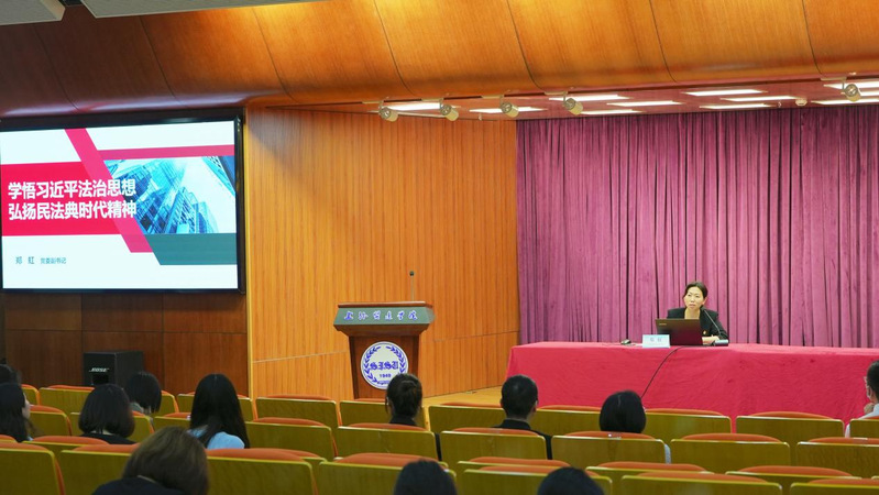 校党委郑虹副书记作《学悟习近平法治思想,弘扬民法典时代精神》专题党课。郑虹副书记带领全体人员深入学习习近平的法治思想,解读民法典的理论知识以及实际生活的运用,提高师生遇事找法、办事依法的意识和能力,进而营造全校知法、尊法、学法、守法、用法的良好法治氛围,助力治校校园建设。