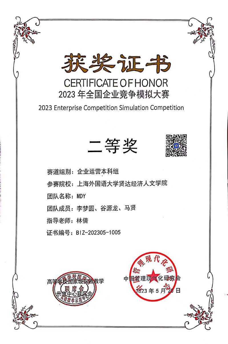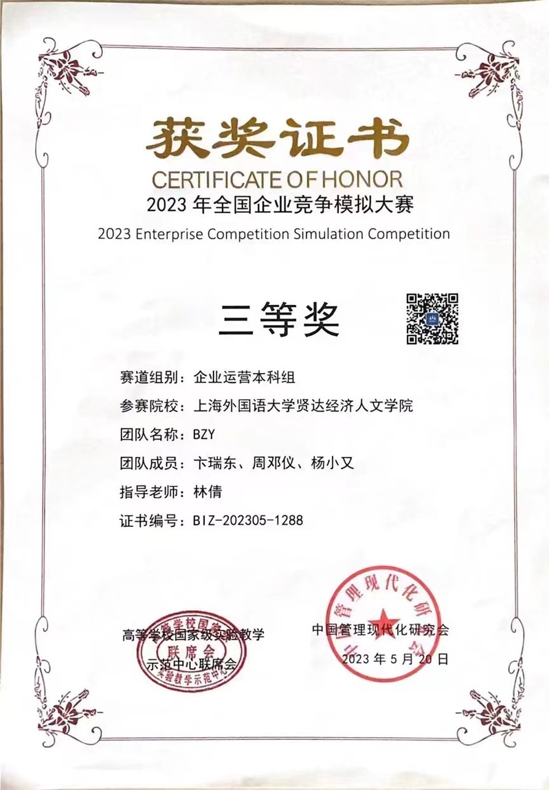 近日,由中国管理现代化研究会、高等学校国家级实验教学示范中心联席会经管学科组共同指导,中国管理现代化研究会决策模拟专业委员会主办的“全国企业竞争模拟大赛”圆满落幕。新葡的京集团商学院工商管理系林倩老师带领5支学生团队参赛,其中MDY队(李梦圆、谷源龙、马贤)荣获全国二等奖,BZY队(卞瑞东、周邓仪、杨小又)荣获三等奖。