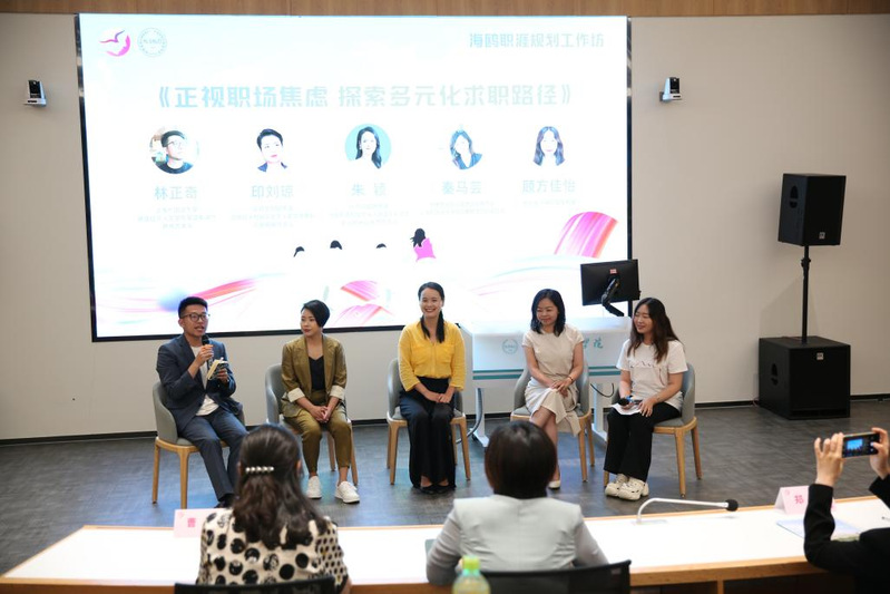 海鸥计划工作组海鸥导师代表王旭介绍了上海市女大学生职业飞翔“海鸥计划”系列活动、海鸥计划工作站(简称海鸥湾)的建设情况以及海鸥“她守护”项目。活动中以对话方式开展了《正视职场焦虑探索多元化求职路经》研讨,刘琼、朱颖、马芸各自分享她们的职业生涯经历以及对于女大学生身心成长、求职的宝贵建议,以此帮助“贤达湾”女大学生提前树立职业生涯规划的意识,直视和缓解职场焦虑,真正地让女大学生们感受到了来自社会的关爱与守护。