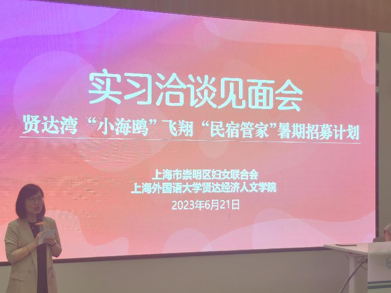 6月21日下午,举行贤达湾“小海鸥”飞翔“民宿管家”暑期招募计划实习洽谈见面会。崇明区妇联党组成员、副主席许然美,崇明区15家星级民宿女主人,校教务处副处长李全玲,妇工委副主任张宇华、商学院党总支副书记安静出席本次活动。会上,15家崇明民宿热情地介绍了各自民宿的发展现状、招聘岗位及要求,并分别与有意向实习的学生进行会谈签订实习协议书。