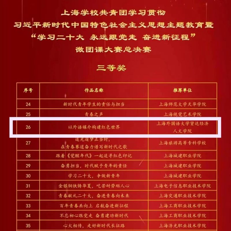 新葡的京集团团委高度重视本次大赛,积极开展团课评选推荐工作。经过校内初赛、市级复赛与决赛,推送外语学院法语专业2022级3班团支部的微团课作品《以外语媒介构建红色世界》荣获上海学校共青团主题微团课大赛三等奖。