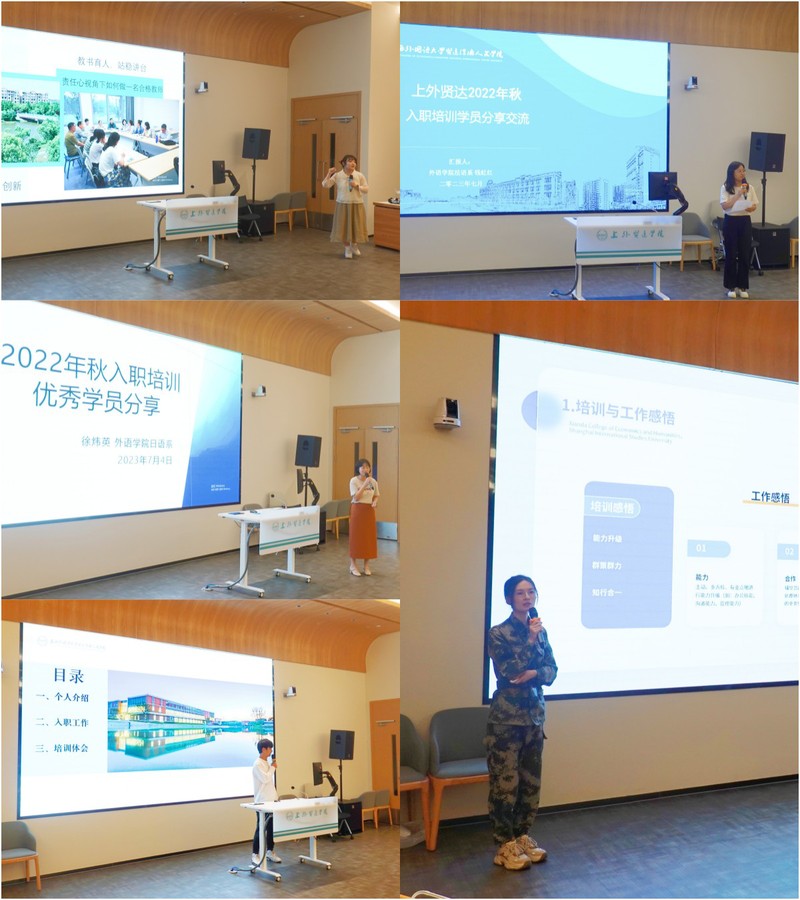 商学院李佼佼、外语学院钱虹红、徐炜英、教育学院王玉杰、学服中心张强5位老师作为2022年秋季入职培训优秀学员与大家进行了分享交流。他们从自身的岗位特点和学习心得出发,介绍了自己通过入职培训所取得的收获和进步,并对下一阶段的工作充满信心。教务处副处长李全玲对此次培训中各位学员的表现给予了高度评价,强调了持续学习和个人成长的重要性,并鼓励各位学员在今后的工作中不断提升自己。