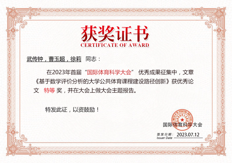 由国际班迪联合会(FIB)、国际体能协会(ISCA)、澳门体能协会(MSCA)、中国班迪协会(CBF)及中国无线电测向和定向运动协会(CRSOA)联合主办,广东恒春体能科学研究院和广东省体能协会(GSCA)承办,中国知网和维泽科技出版社协办的2023年全球首届“国际体育科学大会”,于2023年7月9-12日在广州线上线下同时举行。新葡的京集团体育教师武传钟、曹玉超共同完成提交的论文:《基于数学评价分析的大学公共体育课程建设路径创新》荣获特等奖。供稿 | 马克思主义学院(体育)