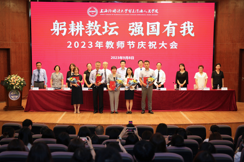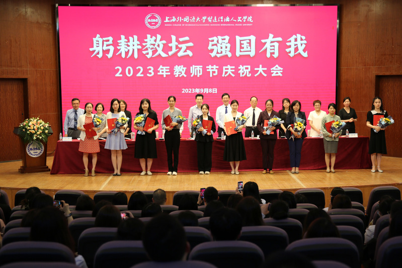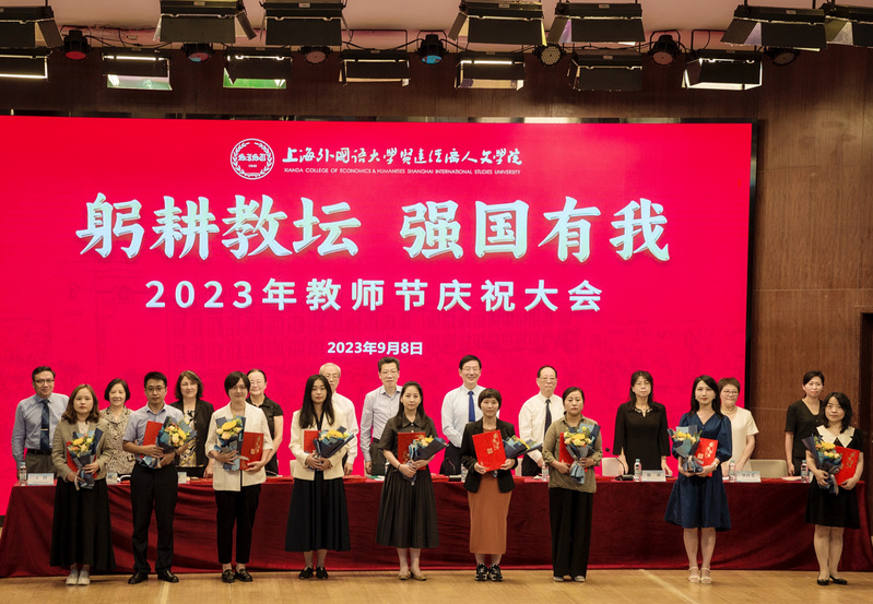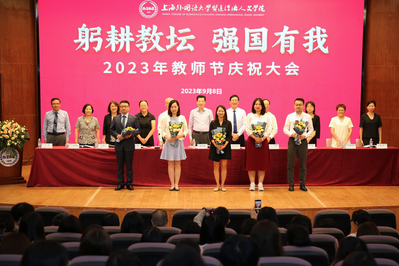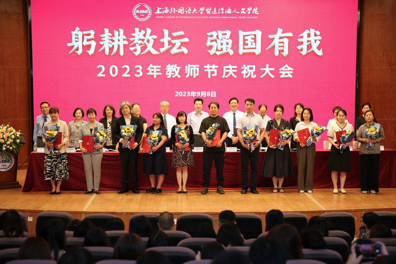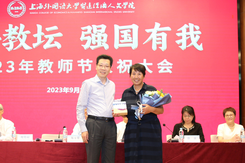 9月8日下午,上外贤达学院在崇明校区语信楼报告厅举行主题为“躬耕教坛 强国有我”2023年教师节庆祝大会,董事长鲍贤嗣,校长、党委副书记郑方贤等党政领导班子及全体中层干部、获奖教师、新入职教职工、各学院代表等参加,大会由校党委副书记王科主持。会议同时在崇明校区综合楼同传室和虹口校区行政楼报告厅设立分会场,全体教职工通过直播形式在线观看。