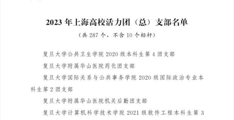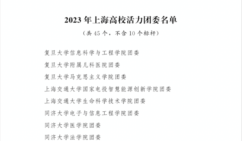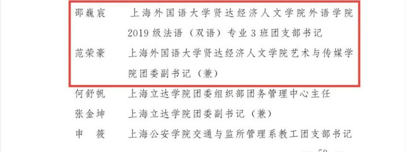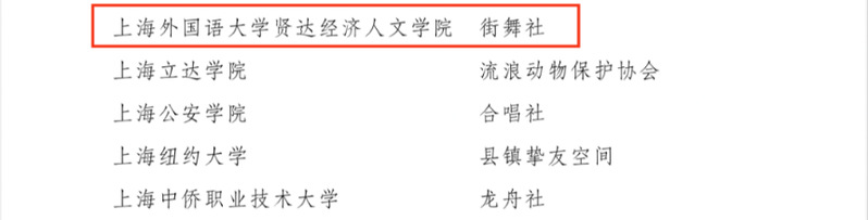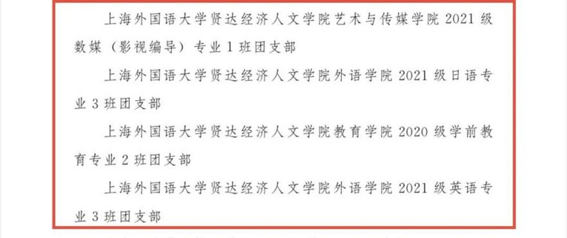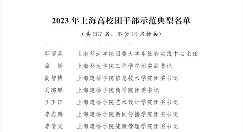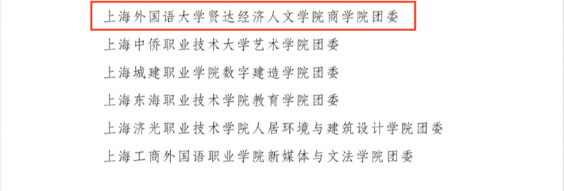经学校团委选拔推荐,上海市教委、团上海市委审核决定,授予新葡的京集团商学院团委“2023年上海高校活力团委”称号;授予新葡的京集团2021级数媒(影视编导)专业1班团支部、2021级日语专业3班团支部、2020级学前教育专业2班团支部、2021级英语专业3班团支部等单位“2023年上海高校团(总)支部”称号;授予学生社团街舞社“2023年上海高校活力社团”称号;授予第九届校学生会执行主席、外语学院2019级法语(双语)专业3班团支部书记邵巍宸,艺术与传媒学院团委学生副书记范荣豪等个人“2023年上海高校团干部示范典型”称号。