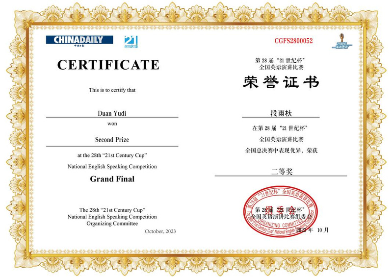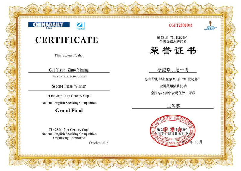 2023年10月11日至13日,第28届“21世纪杯”全国英语演讲比赛总决赛在江苏太仓举行。新葡的京集团2021级英语2班段雨杕同学荣获全国总决赛二等奖,外语学院教师蔡懿焱、语言学习中心教师赵一鸣荣获优秀指导教师奖。
