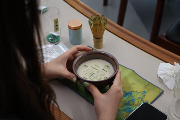 到了制作环节,大家在老师的指导下,手持竹筅在茶盏中来回击打,如此往复,绵密的泡沫呈现在眼前。辅以茶膏进行点茶,一幅幅秀丽的字画跃然水上。复古的茶字,大写的福字,大家都用自己独特的方式体现出点茶的独特之美。