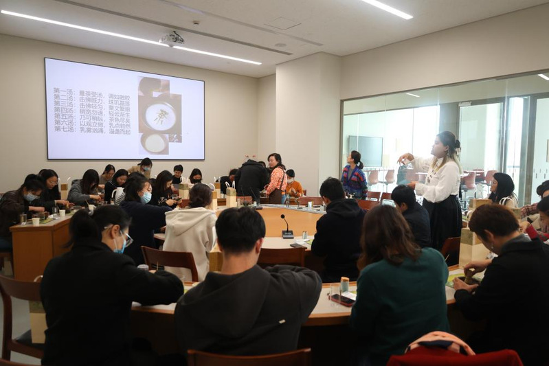 本次活动邀请了高级茶艺技师为大家讲课,老师边讲解边演示,动作优雅、行云流水,为大家展示了宋代点茶的基本流程:煎水、择茶、调膏、点茶、击拂。老师演示的每一道工序都充满了人文艺术美感,还原了宋代鼎盛时期文人骚客雅致的生活,大家都被点茶的意境深深吸引。