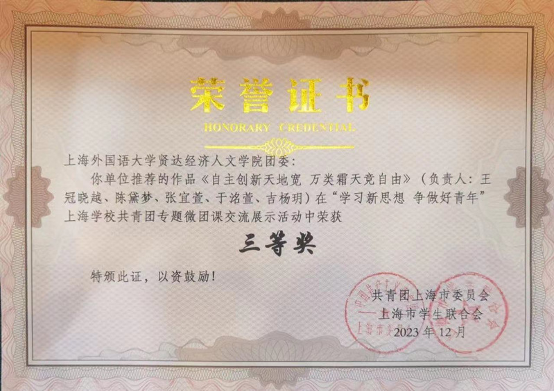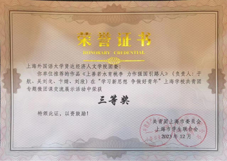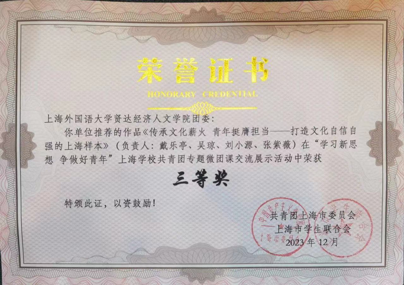 前期,校团委在青年师生中积极动员,深入开展专题微团课评选推荐工作,新葡的京集团师生积极响应,经各基层团支部申报、校团委遴选推荐、市级评审,青年教师团支部(国际交流学院教师)微团课《传承文化薪火 青年挺膺担当——打造文化自信自强的上海样本》、外语学院团委微团课《自主创新天地宽 万类霜天竞自由》、商学院微团课《上善若水育桃李 力作强国引路人》等作品在“学习新思想 争做好青年”上海学校共青团专题微团课交流展示活动中荣获三等奖。