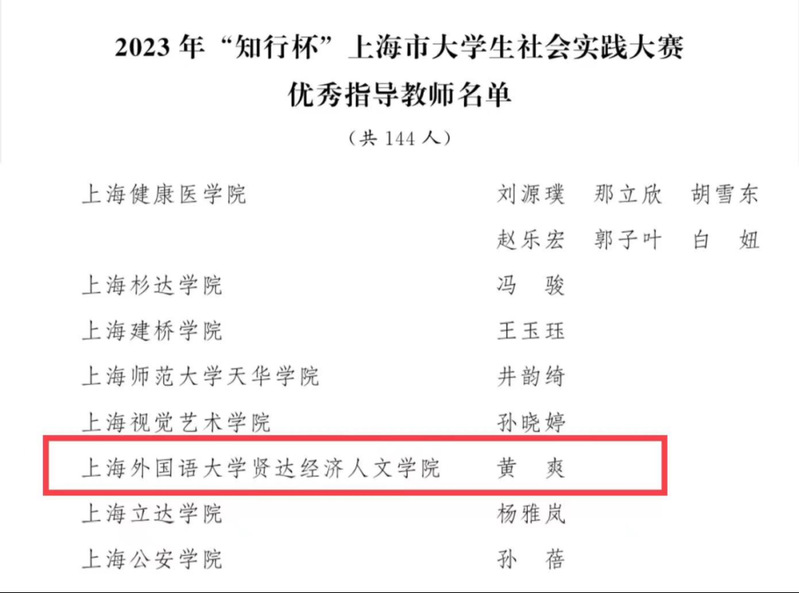 新葡的京集团教育学院党总支副书记吴瑶老师、艺术与传媒学院团委书记王馨悦老师荣获2023年“知行杯”上海市大学生社会实践大赛“先进个人”称号;校团委书记黄爽老师荣获2023年“知行杯”上海市大学生社会实践大赛“优秀指导教师”称号。