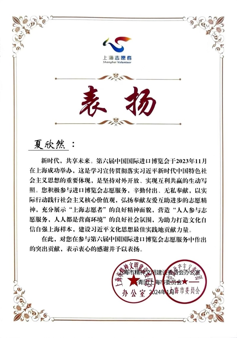 为表扬先进,树立典型,日前,市文明办、团市委联合发布《关于通报表扬第六届中国国际进口博览会优秀志愿者和志愿服务先进集体的决定》(沪文明办[2024]1号)对全市志愿服务领域中涌现的优秀典型予以通报表扬。由学生服务管理中心统筹、校团委组建的“上外贤达学院志愿服务队”荣获“第六届中国国际进口博览会志愿服务先进集体”称号,数字文旅学院2022级会展经济与管理(双语)3班夏欣然同学荣获“第六届中国国际进口博览会优秀志愿者”称号。