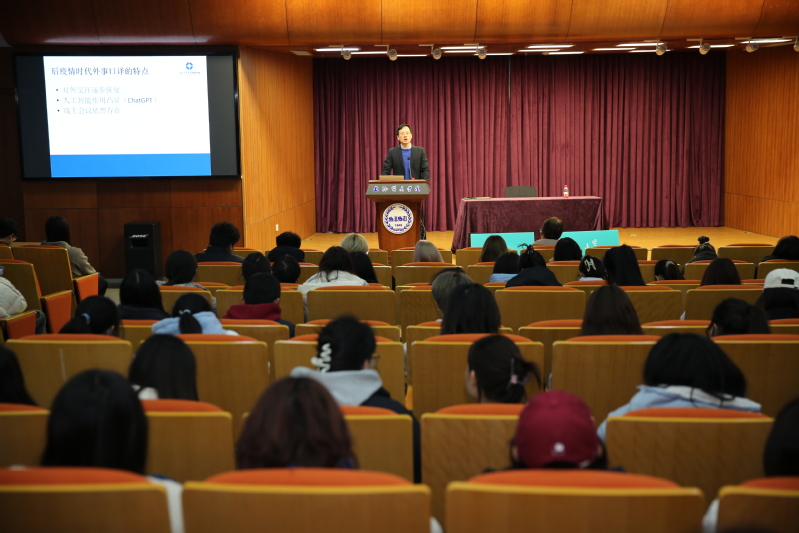 讲座中,王健卿对新时代汉英翻译的背景与挑战进行了全面梳理,总结了后疫情时代外事口译的特点。为了让学生更好地理解新时代汉英翻译的实践应用,他选取了一些具有代表性的外事翻译案例,从词汇选择、句式结构、文化内涵等方面进行了分析,展示了如何利用ChatGPT获取译法选择,鼓励学生在提高汉英翻译水平的同时,合理利用人工智能技术资源,保障和提升翻译质量。讲座尾声,王健卿结合自身经历与学生们进行了互动交流,解答了关于汉英翻译和中外商务贸易的诸多疑问。