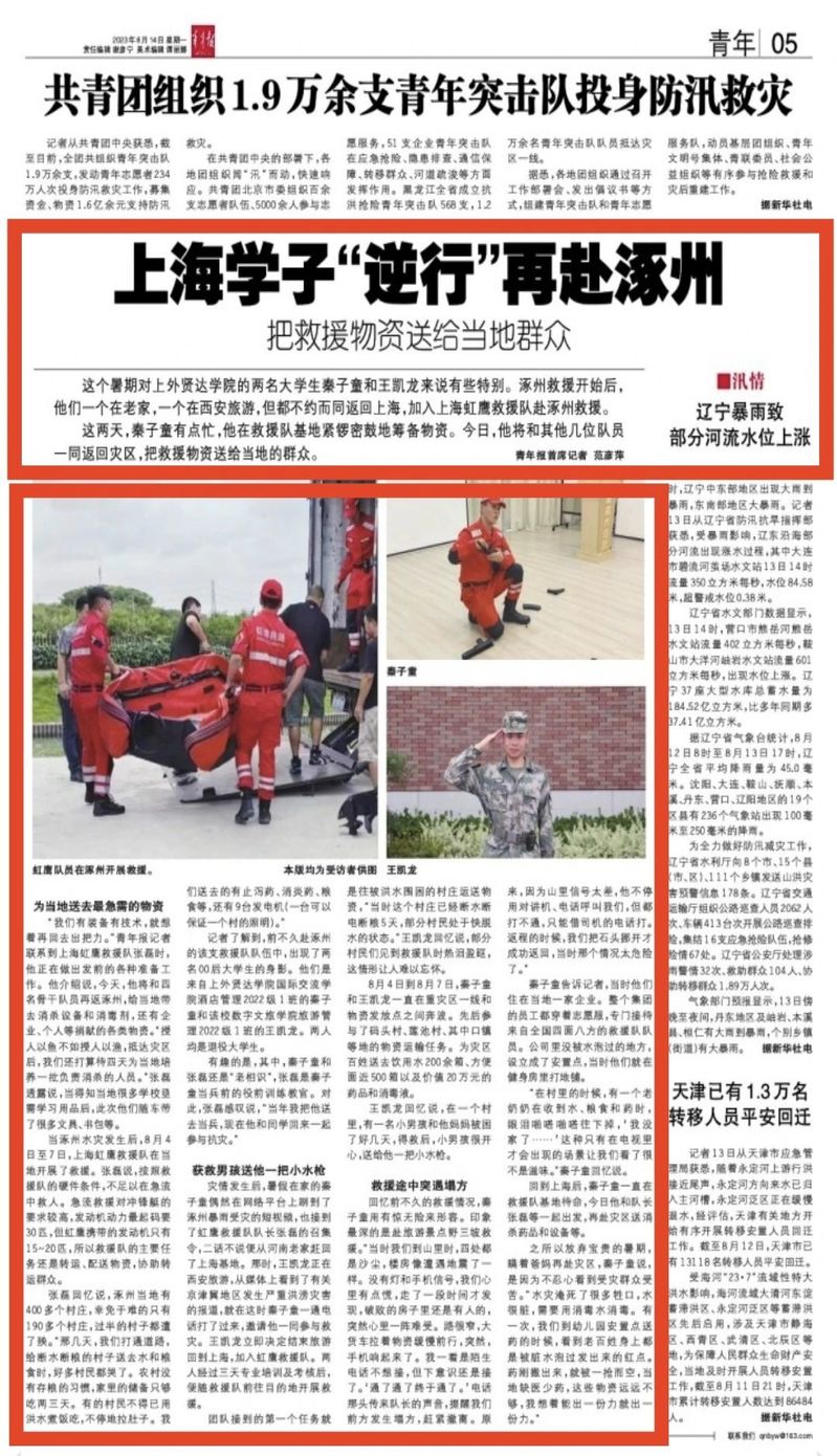 2023年8月初,河北涿州遭遇严重洪涝灾害,牵动着全国人民的心,一支来自上海民间的救援志愿服务队火速集结,奔赴当地,在队伍中有两名00后青年的身影,他们就是新葡的京集团学子——秦子童、王凯龙。两位同学通过网络看到洪水肆虐、涿州告急的情景,同时收到虹鹰救援志愿服务队的召集,第一时间从河南和西安奔赴上海基地,带着救援设备和物资,随队前往河北涿州灾区,在当地应急管理局的统一指挥下开展救援。