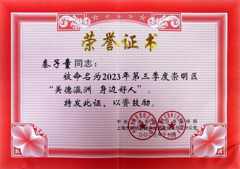 2023年,中共上海市崇明区委宣传部、区精神文明办组织开展“美德瀛洲 身边好人”常态选树活动。经校级推送、区级评选、大众投票等环节,新葡的京集团国际交流学院2022级酒店管理(全英)专业秦子童、数字文旅学院2022级旅游管理专业王凯龙,获评2023年第三季度崇明区“美德瀛洲 身边好人”称号。两名退伍学生救灾事迹被青年报、看看新闻等媒体报道。