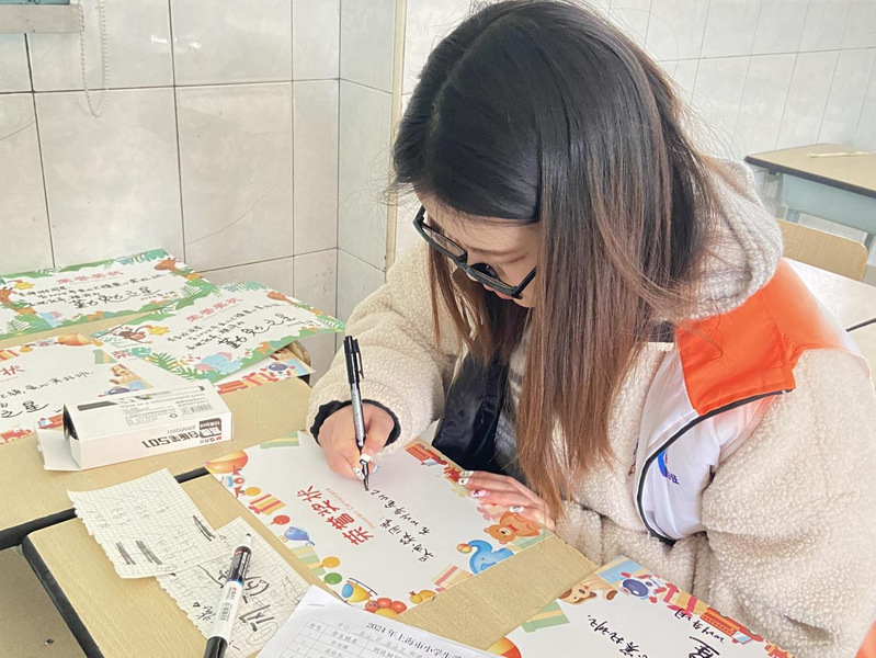 在寒假期间,黄思佳同学报名参加上海市金山区金山卫镇的爱心寒托班活动,是一名大学生志愿者,负责照看小朋友们的日常生活,为小朋友们打造一个安全、有趣和充实的寒假生活。在志愿服务期间,黄思佳同学协助任课老师完成教学任务,督促小朋友们的日常学习,发挥自身专业特长帮助小朋友们完成画画、剪纸作品等。