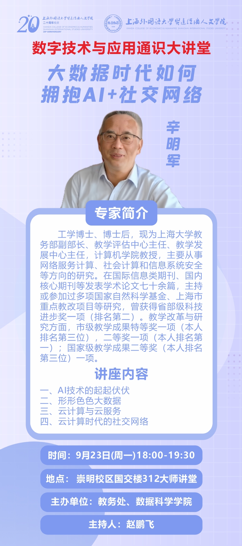 9月23日 辛明军:大数据时代如何拥抱AI+社交网络(数字技术与应用通识大讲堂)