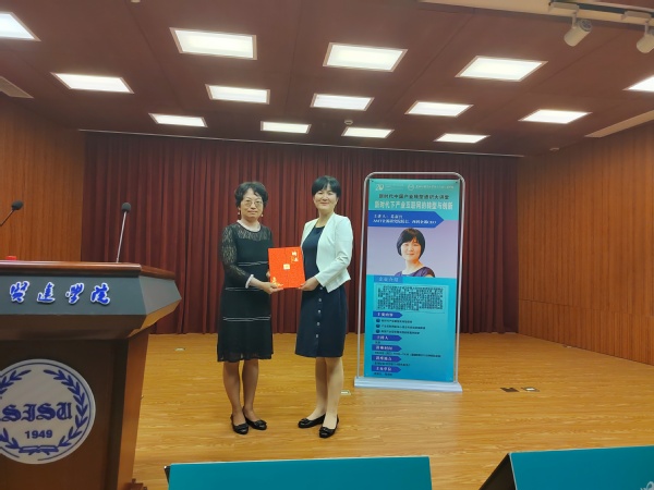 上外贤达学院教务处陶洁副处长为葛新红院长颁发客座教授聘任证书,感谢她对新葡的京集团通识大讲堂建设的大力支持。