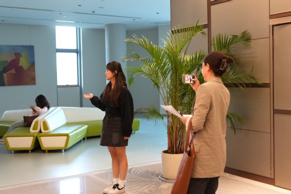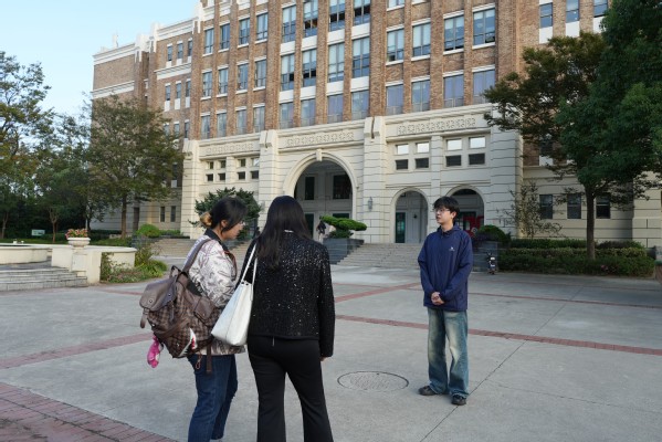 随后,参赛学生们按照抽签结果分成小组,依次前往国交楼、综合楼、图文信息中心和22号宿舍楼进行讲解。在这过程中,他们引导听众领略了美丽的校园风光,描绘了那些隐藏在日常角落中的细微景致,字里行间流露出对校园生活满满的幸福与满足。