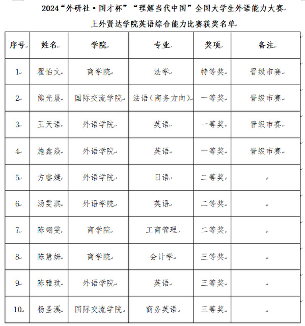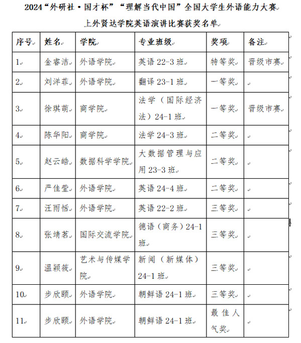10月13日,2024“外研社·国才杯”“理解当代中国”全国大学生外语能力大赛上外贤达学院综合能力校赛在语信楼518成功举办。10强选手也受邀来到赛场观赛、参加颁奖仪式,领取荣誉证书和奖品。
