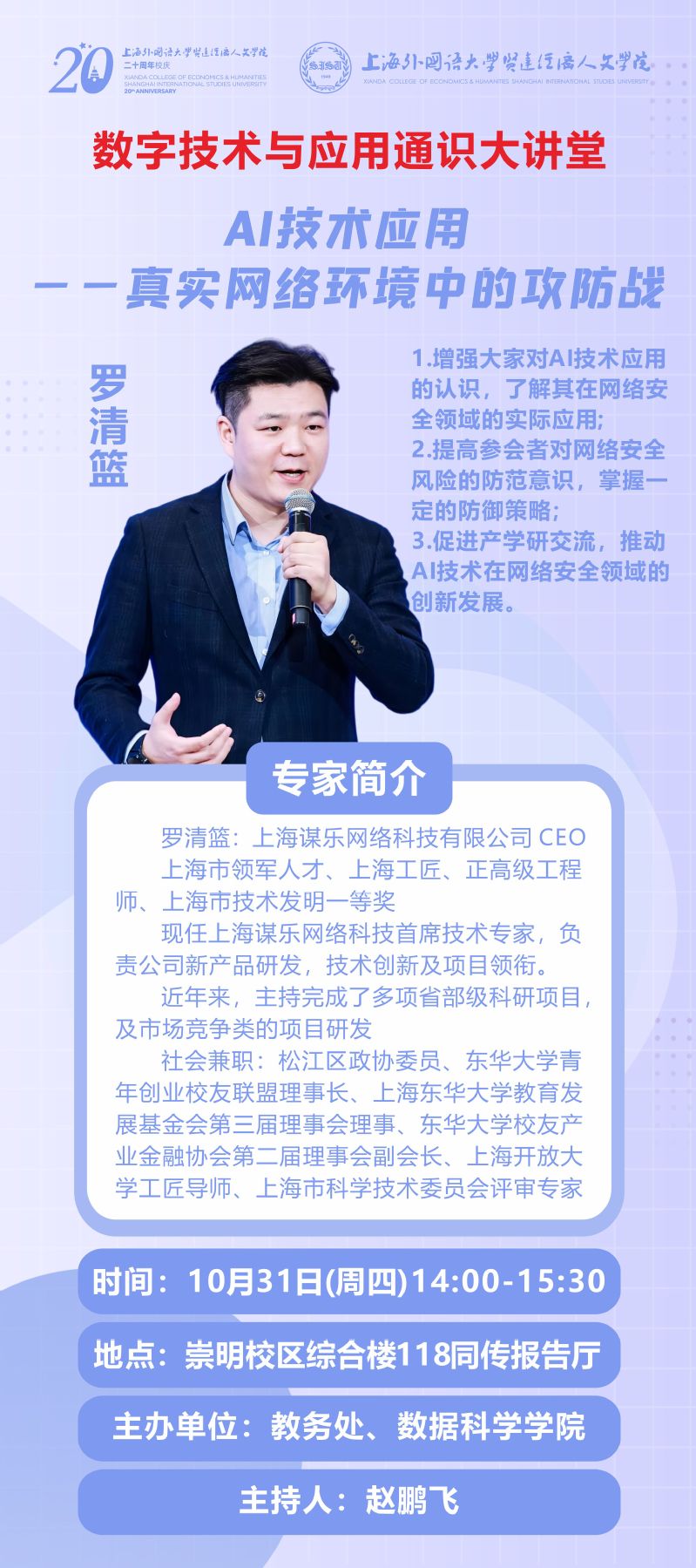 10月31日 罗清篮:AI技术应用——真实网络环境中的攻防战(数字技术与应用通识大讲堂)
