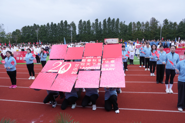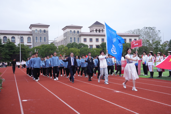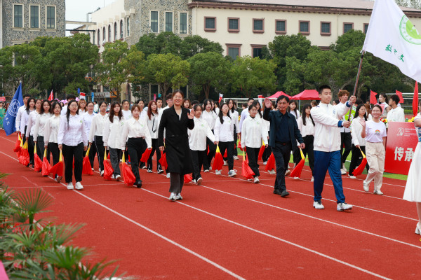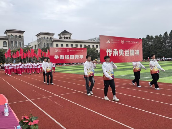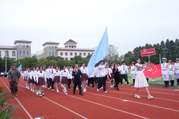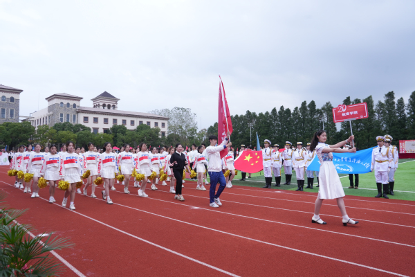 入场式开始,伴随着高昂优美的《我爱你,中国》旋律,学校国旗队队员高举鲜艳的五星红旗和学校校旗队步伐矫健地走进体育场。现场奏响节奏鲜明的《运动员进行曲》,由八名男同学肩扛“传承奥运精神、争做强国青年”两块牌匾走在前面,紧随其后的是由36名男同学和36名女同学组成的刀旗方阵和花束方阵。国际教育学院、数据科学学院、艺术与传媒学院、商学院、外语学院、教育学院、数字文旅学院、国际交流学院等各学院代表队和学校棒垒球队、教职工队伍依次入场,每支队伍行进到主席台前,都通过各种形式的表演,表达了对学校20周年校庆的祝福。校领导、嘉宾和全场观众起立用热情的掌声和欢呼声欢迎各支队伍入场。