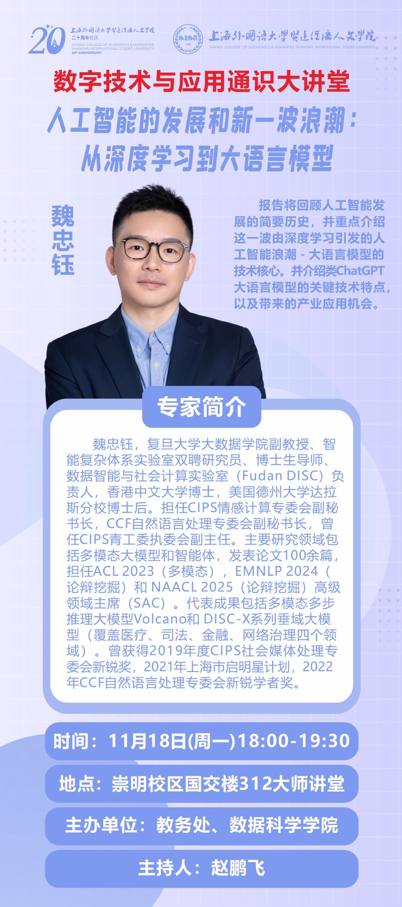 11月18日 魏忠钰:人工智能的发展和新一波浪潮:从深度学习到大语言模型(数字技术与应用通识大讲堂)