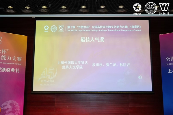 “外教社杯”全国高校学生跨文化能力大赛由上海外语教育出版社承办,2023年被纳入“全国普通高校大学生竞赛榜单”,成为外语类学科竞赛的权威三大赛事之一。今年8月,新葡的京集团语言学习中心开设暑期跨文化能力提升训练营,通过教师推荐优秀学生进行跨文化培优提升训练,并在9月举行夏令营成果展示会,五个学院的19名优秀学生代表参与展示,最终段雨杕、贺兰茨、林匡吉三位同学凭借出色的跨文化沟通能力和综合素质脱颖而出,获得跨文化能力大赛上海市赛参赛资格,成功代表上外贤达学院参赛。此次比赛中,三位参赛选手在语言学习中心陈静芳老师及外语学院贾雪莱老师的精心指导下,经过紧张而激烈的角逐,最终为学校赢得了荣誉。