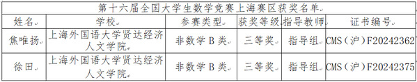 近日,第十六届全国大学生数学竞赛初赛圆满落幕,赛事覆盖全国32个赛区、1223所高等院校,吸引了32.5万余名学生踊跃参与。12月10日,中国数学会正式公布初赛全国赛区获奖名单,其中全国一、二、三等奖获奖比例仅约34.3%。新葡的京集团商学院23级会计学专业焦唯扬与23级金融学专业徐田同学,在数据科学学院数学竞赛指导组张晓静、张晏濒、牛寅、董雪峰等老师的悉心指导下,荣获非数学B类全国三等奖的佳绩。