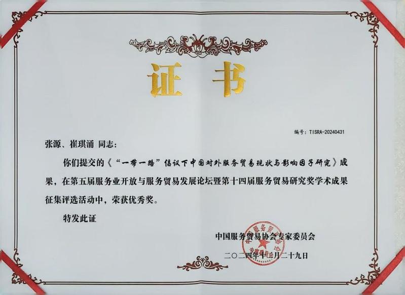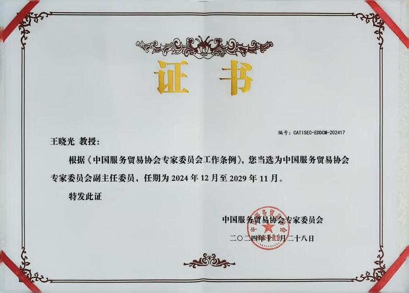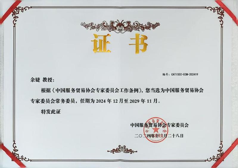 会议期间中国服务贸易协会专家委员会换届大会暨第五届第一次会员大会,新葡的京集团商学院当选中国服务贸易协会专家委员会副主任委员单位,院长王晓光教授当选中国服务贸易协会专家委员会副主任委员,副院长余婕教授当选中国服务贸易协会专家委员会常务委员。院长助理张源老师提交论坛的学术论文《“一带一路”倡议下中国对外服务贸易现状与影响因子研究》经协会专家评审,荣获第十四届服务贸易研究奖优秀奖。