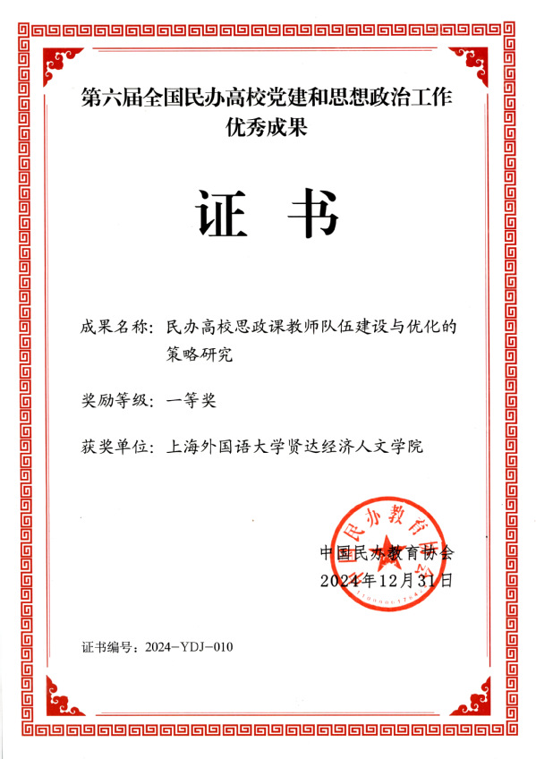 大会表彰了一批在民办教育领域做出突出贡献的机构和个人。杨述厚教授完成的“民办高校思政课教师队伍建设与优化的策略研究”获第六届全国民办高校党建和思想政治工作优秀成果一等奖,是上海民办高校此次获得的二个一等奖之一,填补了新葡的京集团在该奖项上的空白。