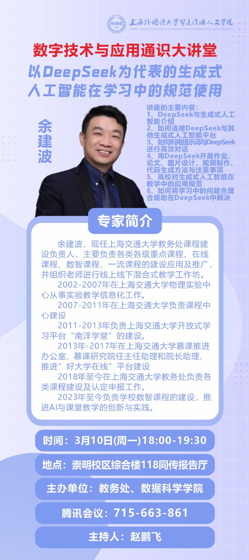 3月10日 余建波:以DeepSeek为代表的生成式人工智能在学习中的规范使用(数字技术与应用通识大讲堂)