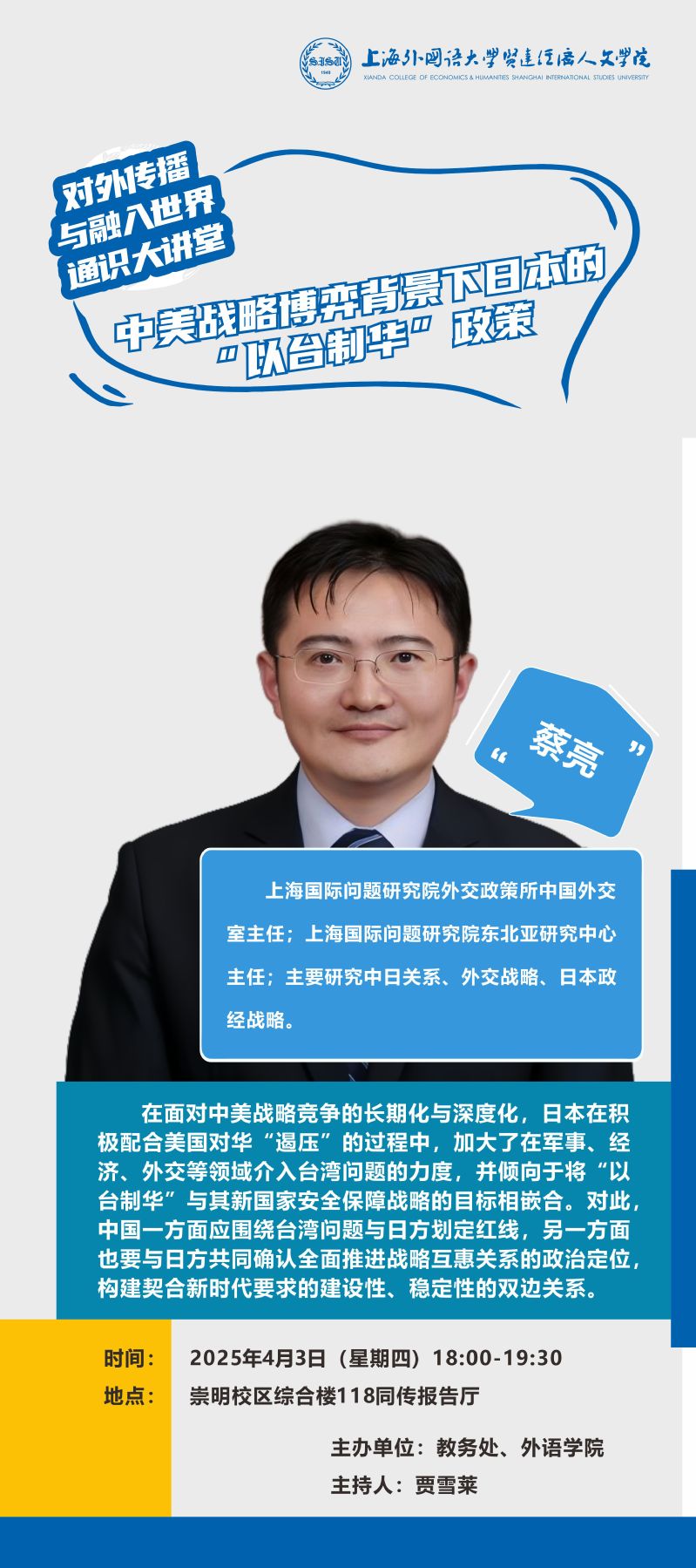 4月3日 蔡亮:中美战略博弈背景下日本的“以台制华”政策(对外传播与融入世界通识大讲堂)