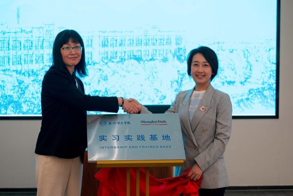在热烈的掌声中,上外贤达学院许星副校长与上海日报社总编辑、上海报业集团国际传播力中心副主任刘琦女士携手为实习实践基地揭牌。