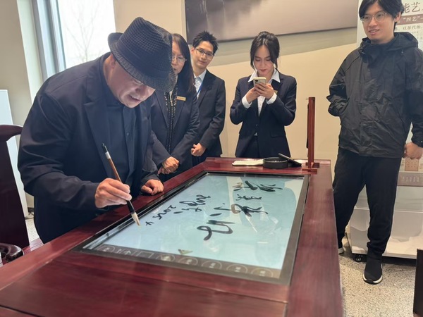 艺术家一行先后参观了校史展、图文信息中心等,详细了解学校建校21年来的发展历程、教育教学成果及国际化办学特色,对“一切以服务学生发展为中心”的办学宗旨给予高度评价。在图文信息中心智慧书法台,孔祥东老师即兴挥毫写下了“樂來樂好”四字墨宝,将音乐韵律与传统书法巧妙结合,这份承载科技与艺术的独特礼物,为校园增添了一份独特的文化印记,也为此次智慧校园之行留下了浓墨重彩的一笔,让在场众人感受到了艺术与教育深度交融的特有魅力。