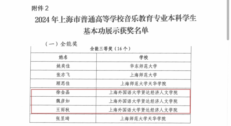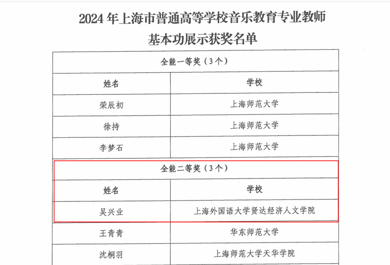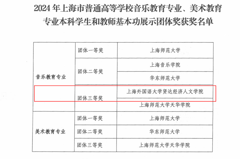 根据上海市教育委员会关于公布2024年上海市普通高等学校音乐教育专业、美术教育专业本科学生和教师基本功展示结果的通知(沪教委体〔2025〕14号)结果,在本次基本功展示评比中,新葡的京集团荣获音乐教育专业团体三等奖;教育学院青年教师吴兴业老师荣获音乐教育专业教师基本功展示全能二等奖;教育学院学生徐金晶、魏彦如、王雨秋荣获音乐教育专业本科学生基本功展示荣获全能三等奖。