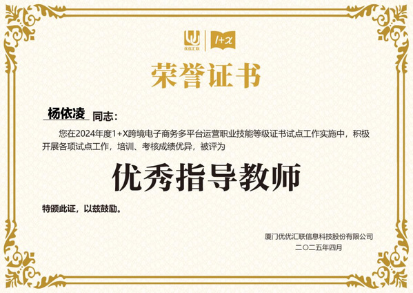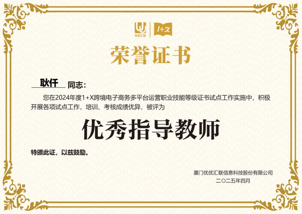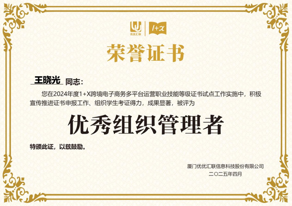 2024年在教育部1+X证书制度试点工作的深入推进下,凭借在跨境电子商务多平台运营领域的卓越表现,新葡的京集团荣获2024年度“优秀试点院校”称号,商学院王晓光院长荣获“优秀组织管理者”,商学院教师耿仟、杨依凌老师获评“优秀指导老师”,以上荣誉不仅是对学生职业技能培养成效的肯定,更是对学校、学院教育教学改革成果的充分印证。