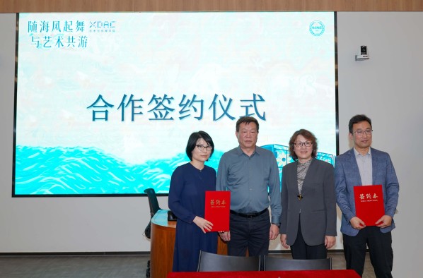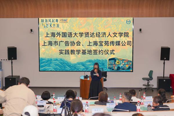 在上海市广告协会会长杜贵根、上外贤达学院副校长马艳红的见证下,上海市广告协会副秘书长邱珊珊、上海宝苑公共交通传媒有限公司总经理高明、艺术与传媒学院数字光线教研中心主任靳雄共同签署合作协议,标志着实践教学基地正式落地。